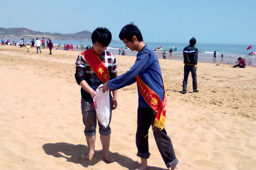 早上,志愿者们来到金沙滩景点,拿着自备的塑料袋清理垃圾,然后再将垃圾归拢到垃圾桶。有的同学自愿担当导游,向游客们介绍金沙滩风景,同时讲了一些在海边游玩的注意事项。活动中,志愿者的不怕脏不怕累的奉献精神,受到了广大游客的赞赏。