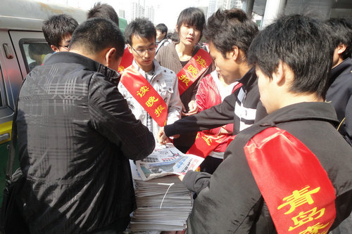 4月17日,商学院学生会组织学生参加了“读早报晚报,做微尘”大型义卖报纸公益活动,践行微尘精神。此次活动由《青岛早报》、《青岛晚报》与青岛市红十字会联合主办。买一份报纸,就有一分钱自动捐入微尘爱心基金。
