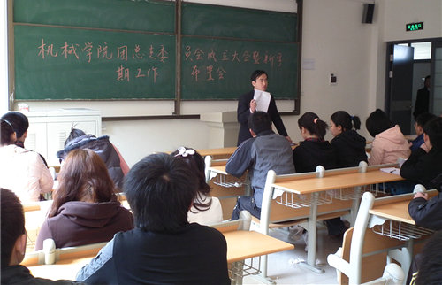 首先,贺治成老师宣布了机械学院团总支委员会成立,其主要成员包括各班团支书、组织委员、宣传委员。接着,贺老师强调了团支书在同学们学习生活中的重要作用,团支书要明确自己的职责与分工,班委、团支部应均衡发展,共同努力为同学们服务。然后,贺老师布置了学院关于在共青团员中开展创先争优主题实践活动的通知,其主要内容有开展党史党情教育、加强业务学习、开展团员建功岗、争创服务名牌、志愿服务、结对共建、弘扬精神内涵等活动。最后,贺老师带领同学们重温了我校“严谨、勤奋、求实、创新”的校训,希望同学们在以后学习生活中,能继承机械学院优良传统,师生之间相互学习,共同进步。