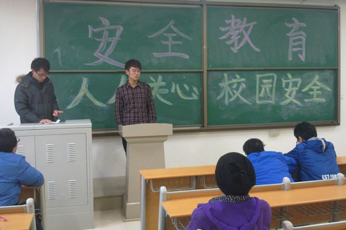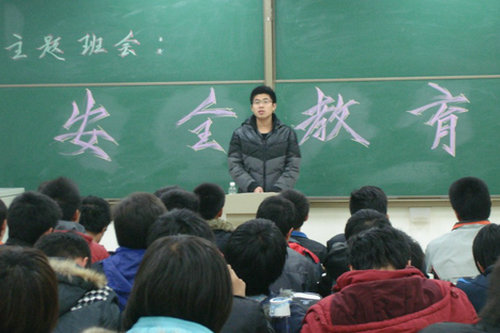 在班会上,按照学院的要求,各班班长首先介绍了学校存在的一些由于建设施工而不可避免的安全问题,旨在提醒同学们提高防护意识,避免校园事故的发生。然后,针对近几年来大学生的安全问题分别从宿舍安全、消防安全、财产安全、交通安全、运动安全、流行传染病安全这六个方面结合一些案例作了详细说明。由于时下正值冬季病流行期间,各班级同学要以宿舍为单位,结合校医院崔晓健院长提供的冬季病预防建议做好预防工作。各班同学们也积极讨论,由宿舍长上台代表发言,提出在安全问题方面的建议。最后各班级团支书总结了这次班会,大家一致强调认为,绝不能放松消防安全这根弦。