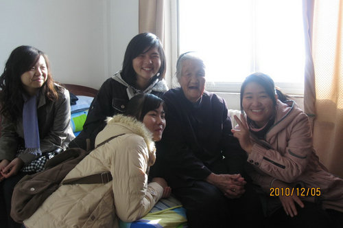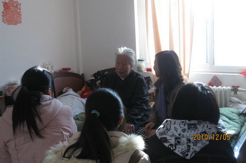早上8点30分,同学们来到了敬老院。在把精心准备的礼物献给敬老院之后,同学们走进老人们的房间与他们亲切的交谈。同学们谈起自己的生活趣事时逗得老人们开怀大笑,同学们还演唱了“红色”歌曲并带动老人们一起唱,让老人们想起那些光辉的革命岁月。同学为老人们打扫房间、梳头发、洗衣服……整个敬老院充满了欢笑声,沉浸在一片和谐的氛围中。最后同学们将带去的水果分给老人们,让每一个老人都感觉到了“家人”的温暖。