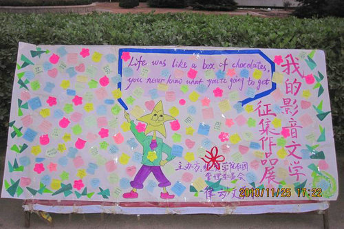 本次活动以向同学们收集自己喜欢的影音文学作品的方式进行。同学们可以写下自己喜欢的台词、歌词亦或文学作品中的名句,内容丰富、自由发挥。活动现场,文学社成员热情的为过往的同学介绍活动内容,同学们积极参加。展桌前围满了感兴趣的同学,有信手拈来的、也有冥思苦想的、也有欣赏作品后书写的。同学们热情洋溢,尽情发挥。活动完毕,展桌上贴满了同学们风格各异的作品。本次活动收集到的作品将以海报的方式展出,并载入文学社论坛。