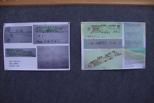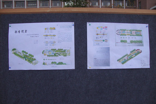 此次比赛共有24份参赛作品参展,展板上展出的作品均凸显创新性,彰显出对理工大学的热爱。艺设086班倪菁菁同学制作的名为“听香闻碧”的中轴对称设计,将景观绿化与生态绿化相结合,绿化、美化、香化、彩化相结合,为同学营造了一个古色古香的校园环境;艺升095班李超同学的设计灵感来源于“丝绸之路”,以服务广大师生为宗旨,目的在于提供一个安静温馨的场所,也表明了他对同学们能有“丝绸之路”上古人不畏艰险,勇于探索的精神的期许;还有可爱生动的“鲤鱼跃龙门”主题,由艺升095班李日祥同学所设计,将设计图做成3D效果图是他的又一特色,将自然和人文景观完美结合。
