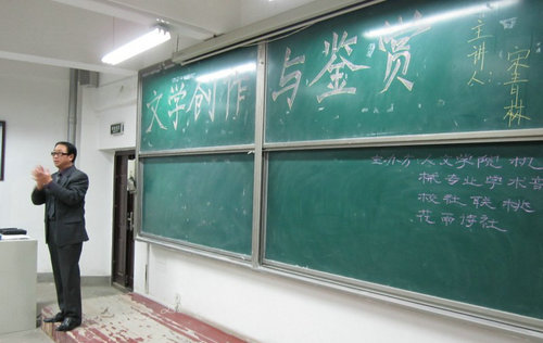 11月16日晚,由人文学院机械专业学生会以及校社团桃花诗社共同主办的一场关于“文学创作与鉴赏”的讲座在2阶304举行。此次讲座由省作家协会会员,青岛开发区作家协会副主席,《金沙滩》文学杂志责任编辑,山东省当代文学院青岛创作中心理事,人文学院文学艺术教学部主任宋青林教授主讲。各兄弟学院学生会负责人和机械各专业的学生参加了此次报告会。