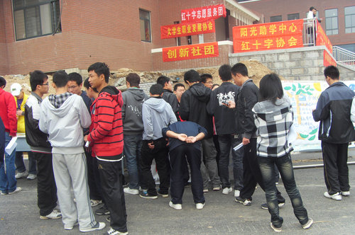 6日,机械、土木、环境三个学院共计18个社团在新校区宿舍区进行了社团招聘大集,其中不乏有荣获全国荣誉称号、省级荣誉称号的红十字志愿服务团、结构设计者协会、环保协会等等。在纳新现场,报名场面火爆,许多社团被包围的水泄不通,前来报名的同学十分仔细地询问社团的活动、章程等有关事项,尽力地寻找适合自己的社团。不同的社团有不同的特色,能够满足不同人的口味。每个社团都取得了骄人的成绩,都有很强的实力和号召力。不到一个小时,报名表格就被填的满满当当,更有许多同学同时选择了多个社团,希望通过多参加活动,让自己得到全面发展。整个招聘现场到处洋溢着轻松、快乐的气氛,到处能感受到青春的气息。10级新生对将来的社团活动十分重视,表现出了浓厚的兴趣,积极主动的咨询社团负责人,对社团“锻炼自我,服务学院,贡献社会”的职责充满期待和信心。(机械学院隋岩涛)