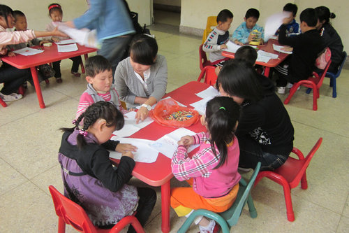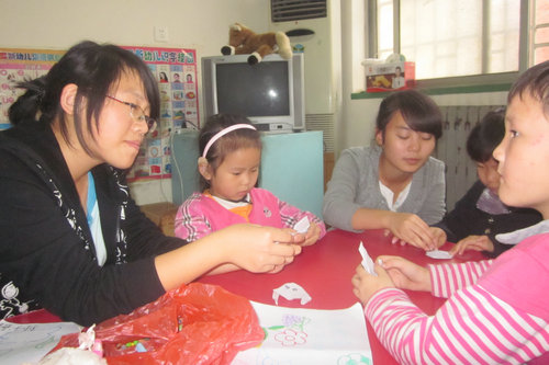 那些孩子年龄多在3到7岁之间,而且大多有听力和语言障碍,当志愿者刚到达康复中心,孩子们就在老师的带领下高兴地跑向志愿者并向志愿者问好。随后,志愿者分成两组,一组在室内,一组在室外。教室内,志愿者伴着形象的肢体动作与孩子们交流。有的握起孩子们的手,手把手地教孩子们画画;有的教孩子们叠纸飞机、小纸帽等;还有的与孩子们一起玩起了智力拼插的游戏。另外,还有志愿者拿出自己带的水果与孩子们分享。教室外,志愿者陪孩子们玩起了滑梯。志愿者们纷纷抱起孩子与他们合影留念。最后,孩子们满脸笑容地与志愿者们挥手告别。