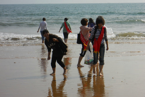 10月23日上午10点,爱心社近30位同学从学校出发,乘公交车到达金沙滩,在宣布了活动的流程后,同学们兵分两路,一组拉着印有“低碳环保行 珍爱金沙滩”字样的宣传横幅及爱心社社旗在海滩上宣传环保知识并组织游客签名;另一组拿着自带的垃圾袋捡拾海滩上的垃圾。在活动的进行中,有大量的游客驻足观看并在宣传横幅上签名,更有游客主动帮助捡拾海滩上的垃圾。在清理活动结束后同学们一起做游戏,一起谈心,以大学生特有的阳光与热情感染着海滩上的每一个人。