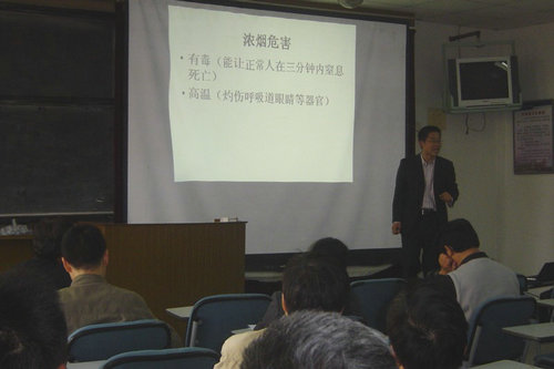 在本次讲座上,肖主任就如何防止火灾发生、初期火灾的扑救、火灾中如何逃生、灭火器的种类和使用方法等消防知识进行了详细的描述,同时向大家讲解了家庭宿舍用电防火、高楼防火的注意事项,对大学生容易忽视的常见消防隐患逐一做出了说明。此外,肖主任针对实验室、办公室、家庭等场所应注意的消防安全工作进行了说明,特别对三分钟灭火自救和一些日常生活中容易忽视而又存在安全隐患的地方进行了强调。