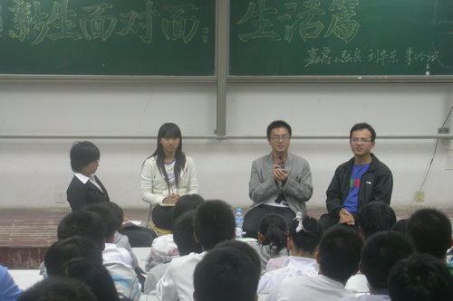 访谈会开始,首先各位学长学姐们与新生们分享了个人经历,并结合自身经历就大学生礼仪问题及感情问题发表了自己的看法,给了新生们很大的启迪。他们指出,新生们应该合理的安排好自己的大学生活,并处理好学习与工作的关系,丰富并充实大学生活。紧接着,在互动环节,同学们针对自己关心的生活问题积极提问。而学长学姐们也都耐心并详细的解答同学们的疑问,并赢得了阵阵热烈的掌声,将访谈会推向了高潮。最后四位嘉宾分别作了总结,嘉宾提出的“务实、勤奋、创新、超越”更是给了同学们深深地鼓舞。