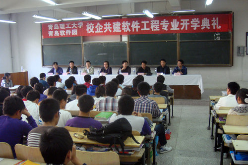 10月12日下午,计算机学院与青岛软件园共建软件工程专业2010级新生开学典礼在黄岛校区举行。计算机学院院长王斌、党总支书记薛炜华、团总支书记曲良波、软件工程教研室主任王成刚、青岛软件园人力资源服务有限公司总经理李战军、副总经理兼市场总监周绍辉、副总经理金澄出席了开学典礼。2010级校企共建软件工程专业全体新生参加了开学典礼,典礼由计算机学院党总支副书记魏俊文主持。