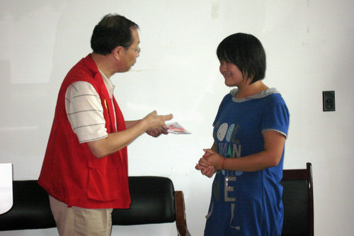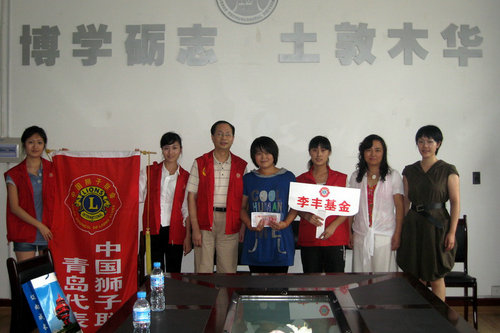 宋玲副书记代表学院对丁主任一行的到来表示欢迎,对这次爱心捐助表示感谢,并简要介绍了学生的学习生活情况。丁茂盛主任介绍了狮子会的概况及近年来青岛代表处助学事迹,这次代表狮子会员李静女士设立的李丰基金来捐助品尝兼优的困难学子,也一是个传递爱心之举,希望今后能够开展更多的合作。丁主任向受助学生当面转交了助学金3000元和纪念T恤,并勉励她要再接再厉,勤于学业,以优秀的表现来回馈关心她的人。