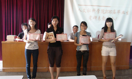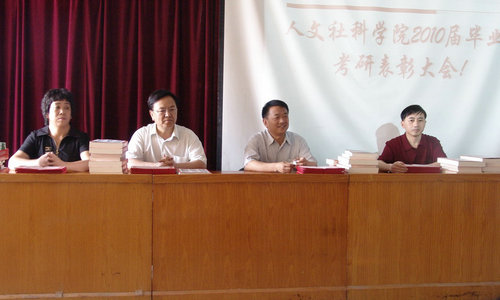 6月25日,人文学院在一教631召开2010届毕业生考研表彰大会。人文学院院长谭业庭,党总支书记王众臣,副书记林桂梅,副院长任颖栀,团总支书记刘聘和辅导员东忠方出席了会议。人文社科学院06级成功考取研究生同学参加了此次会议。