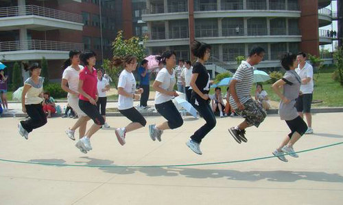 六月,是一个阳光灿烂的季节,2010届毕业生即将在这个拥有最美丽阳光的季节里结束他们的大学生活,走向新的征程。6月27日上午,一场别开生面的跳大绳比赛在二教门前进行。毕业生辅导员董兰国老师、毕业生班主任和毕业生们一起参加了这次比赛。