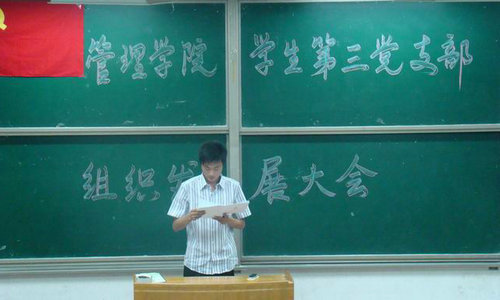 在鲜艳党旗下,伴随着《国际歌》激昂的旋律,组织发展大会正式开始。42名同学分别向大会宣读了入党志愿书,详细介绍了自己在政治、思想、学习、社会工作、生活等各方面情况。然后支部大会讨论并举手表决,决定是否同意接纳其加入党组织。大会紧张而有序地进行,一致同意接纳42名同学为中共预备党员。