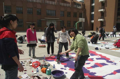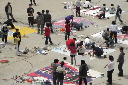本次“和谐校园”大地画比赛,旨在加强各学院之间的交流,锻炼同学的团队意识与创新能力。活动要求每支参赛队以“舞动·青春”为主题将作品画在3×3米的地上。主办方希望借此次活动使同学能够重新审视自己的大学生活,营造一个和谐的文化氛围。 (建筑学院)