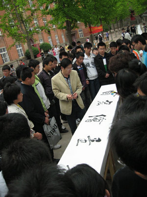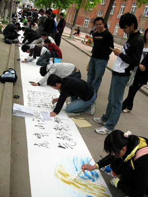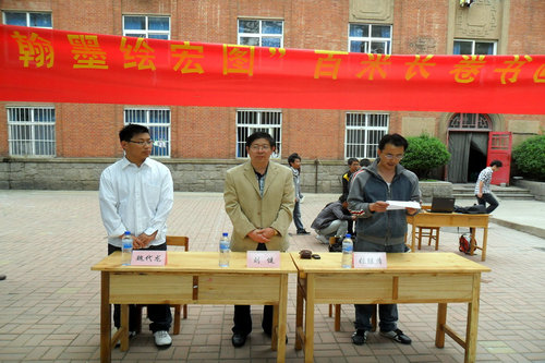 16日上午9点,大赛在四方校区北院开幕。学院党总支书记刘健、辅导员张继清等出席开幕式。张继清老师致开幕辞,鼓励同学们尽享墨香熏陶,发扬艺术之光,提高自身修养,共建和谐校园。刘健教授宣布大赛开幕并现场题词“翰墨绘宏图”,五个大字熠熠生辉,令人称羡。同学们汇聚在林荫小道上,在百米白绢上开始了挥毫泼墨,直抒胸臆,尽展才华。