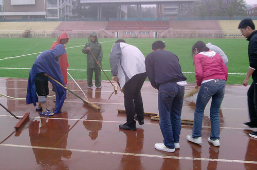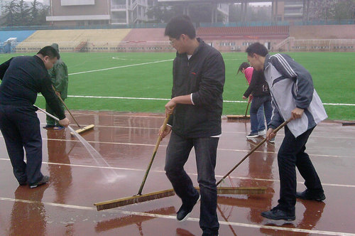穿着雨衣的后勤人员和穿着校服的学生在雨中成为田径场上一道亮丽的风景。他们秉承 “人人为我,我为人人” 的精神,不怕苦不怕累,干得热火朝天,衣服外面是雨水里面则是汗水。足球场上绿色的草坪在雨中显得生机勃发,增加了同学们干活的热情,后勤人员的称赞和感谢增添了他们心中的喜悦,看着被打扫过的洁净的跑道他们更是充满自豪。