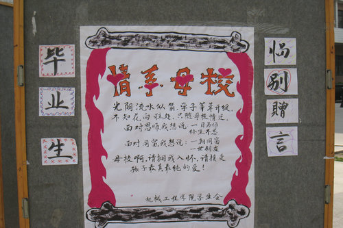 为了聆听即将毕业的学子对母校的怀念,对恩师的不舍,对学弟、学妹的嘱托的心声。机械学院于5月5日特别举办了“情系母校 谏言展览”活动。