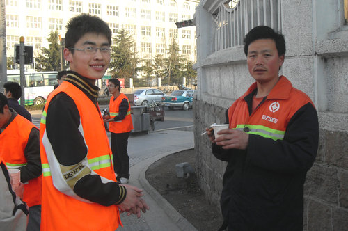 义扫结束后,志愿者为环卫工人献上一杯水,道一声:“您辛苦了”。环卫工人开始有些受宠若惊,默默奉献的他们好像是从未受过如此的尊敬,志愿者不禁深思为什么他们付出的那么多,得到的却这么少。一次偶然的机会才得知原来环卫工人大部分都是农民工,他们大多数都年过半百,一个月拿着七八百工资,一星期却有八九十小时的工作时间。早上三点就得上班,傍晚六七点才下班。遇到刮风下雨的,那工作就更是辛苦了。他们的付出已经远远超过他们的回报。难道就是因为他们是农民工,因为他们没文化,就得默默奉献而不求回报吗?虽然志愿者不能让环卫工人得到合适的工资,但志愿者可以让他们得到应该得到的尊敬!一个微笑,一杯水,一个拥抱,都可以给他们温暖,让他们得以慰藉。