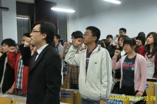 最后,到场的全体人员都面向团旗庄严宣誓,重温了当年的入团誓词,并一起齐唱团歌。神圣庄严的誓言,高亢激越的团歌唤起了青春的风华和青年火一样的激情,嘹亮的歌声回荡在教室中,振奋人心。