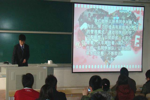 为进一步推进优良学风班创建工作,促进学风建设,管理学院于近期组织召开了“优良学风班创建答辩大会”。 管理学院07、08、09级3个年级共50多个班级分4场进行了答辩。管理学院党总支副书记申维东、团总支书记于利俊、各年级辅导员出席了答辩大会,各班班委也参加了会议。