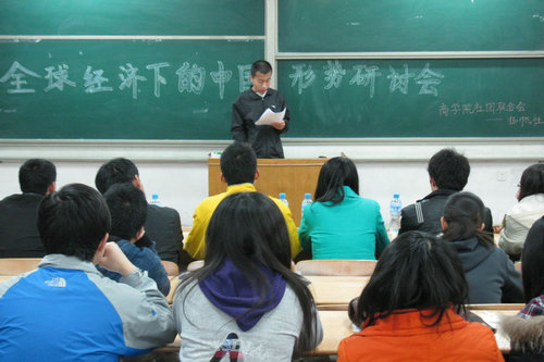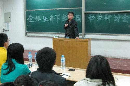 此次研讨会分为三个环节:同学发言,教师点评,师生互动。在发言环节,同学们积极踊跃的表述了自己对全球经济下中国形势的认识。其中包括全球化给中国带来的机遇、建议低碳经济、次债危机下我国如何应对国际社会的贸易保护主义,并提出了熟练运用WTO规则,转变贸易增长方式,鼓励企业走出去,进行对外经济技术合作和对外直接投资,发挥政府作用积极引导企业自主创新,加强我国企业的合作等建议。此后,胡老师对同学们的发言作了总结:首先,他肯定了实施低碳经济的观点,又补充说明了贸易保护方面的片面性。并提出改变秩序,建立新秩序,建议实施全球经济一体化,节约资源方案应结合中国实际等建议。同时结合房产等热点话题对中国经济形势进行了分析。此外,胡老师提出,选手们的演讲缺少与同学们的互动,缺少自己的思考,没有自己的观点。希望下一次有所改进。最后的师生互动环节中,胡老师对于低碳经济与房产的关系等问题做了详细的讲解。并提出由于中国经济基础低,赶超美国需要一定的时间,并且,我国有些方面已经赶超美国。并分析了中国不是没有需求而是价格高抑制了对房子的需求等。研讨会历时一个半小时,最后在愉悦的氛围中结束。